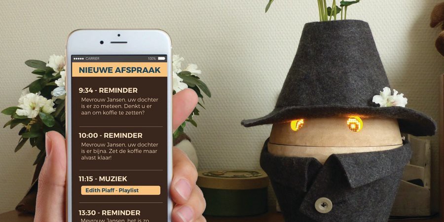 Depuis les Pays-Bas, Tinybots (créé en 2015) a développé un petit robot social appelé Tessa qui aide les personnes âgées atteintes de démence en leur fournissant des rappels systématiques, de la musique personnalisée, des contes, une thérapie cognitive et des instructions vocales pour les tâches quotidiennes. En utilisant une application, les soignants peuvent configurer un Tinybot pour les besoins et des souhaits personnels. Le robot Tessa ne ressemble pas à une machine, mais ne ressemble pas non plus à un animal en peluche : grâce à sa structure construite en bois, il s’intègre parfaitement entre vases et autres bibelots dans un intérieur moyen. A intervalles réguliers Tessa parle à sa colocataire, puis propose de jouer de la musique, ou de prendre une bouffée d’air frais. Le robot « entend » après une longue période de silence qu’il est temps d’entrer en action, et peut également être programmé avec une application par un membre de la famille ou un aide-soignant. Il peut annoncer son arrivée, afin que l’utilisateur de Tessa puisse s’y préparer. Même si Tessa répond à des questions simples et s’adapte à sa colocataire, ce n’est pas un chatbot. Cela semble simple, mais Tessa s’appuie sur des années de recherche sur la conception et les fonctionnalités dont les aide-soignants et les patients ont vraiment besoin.