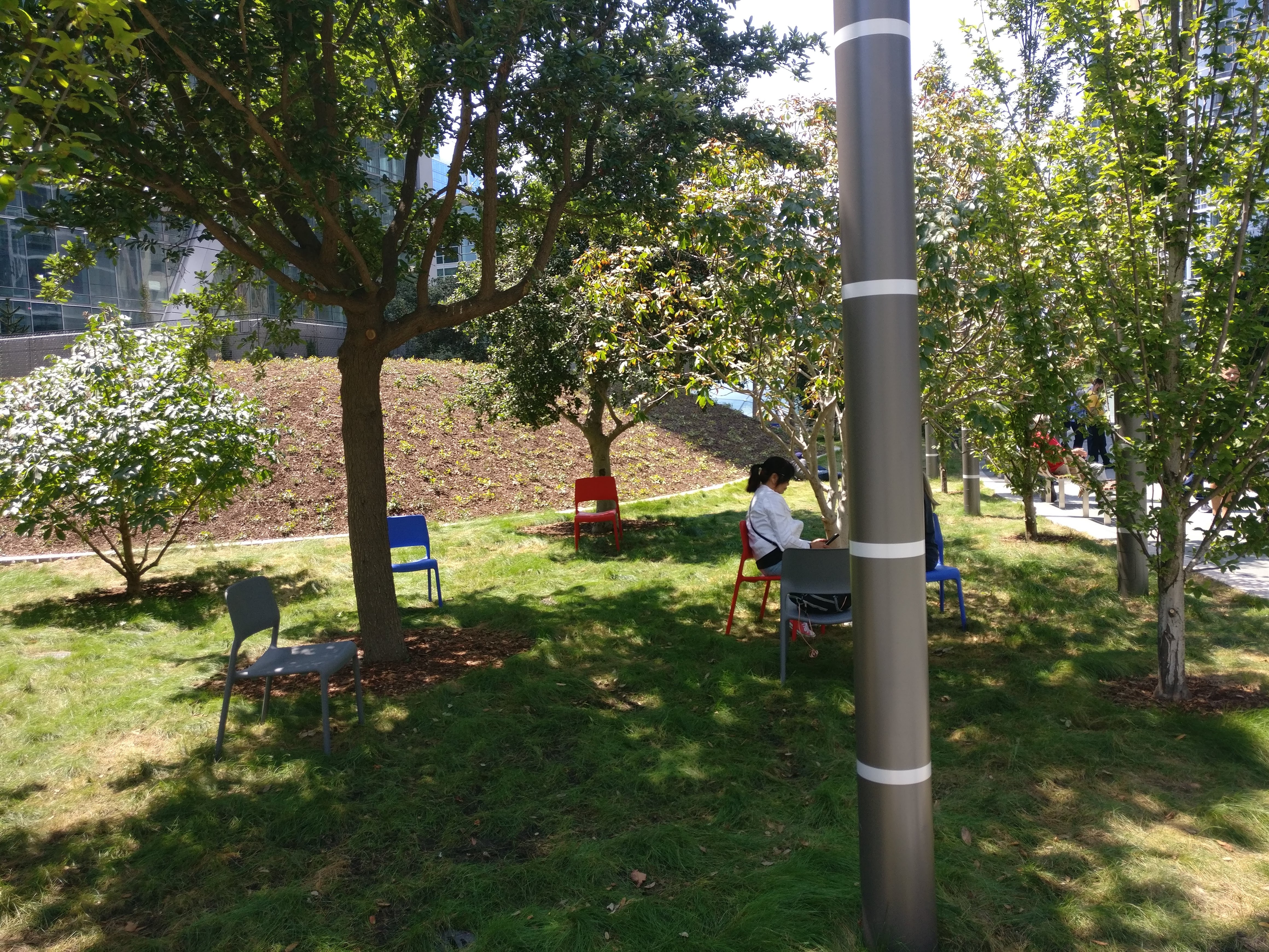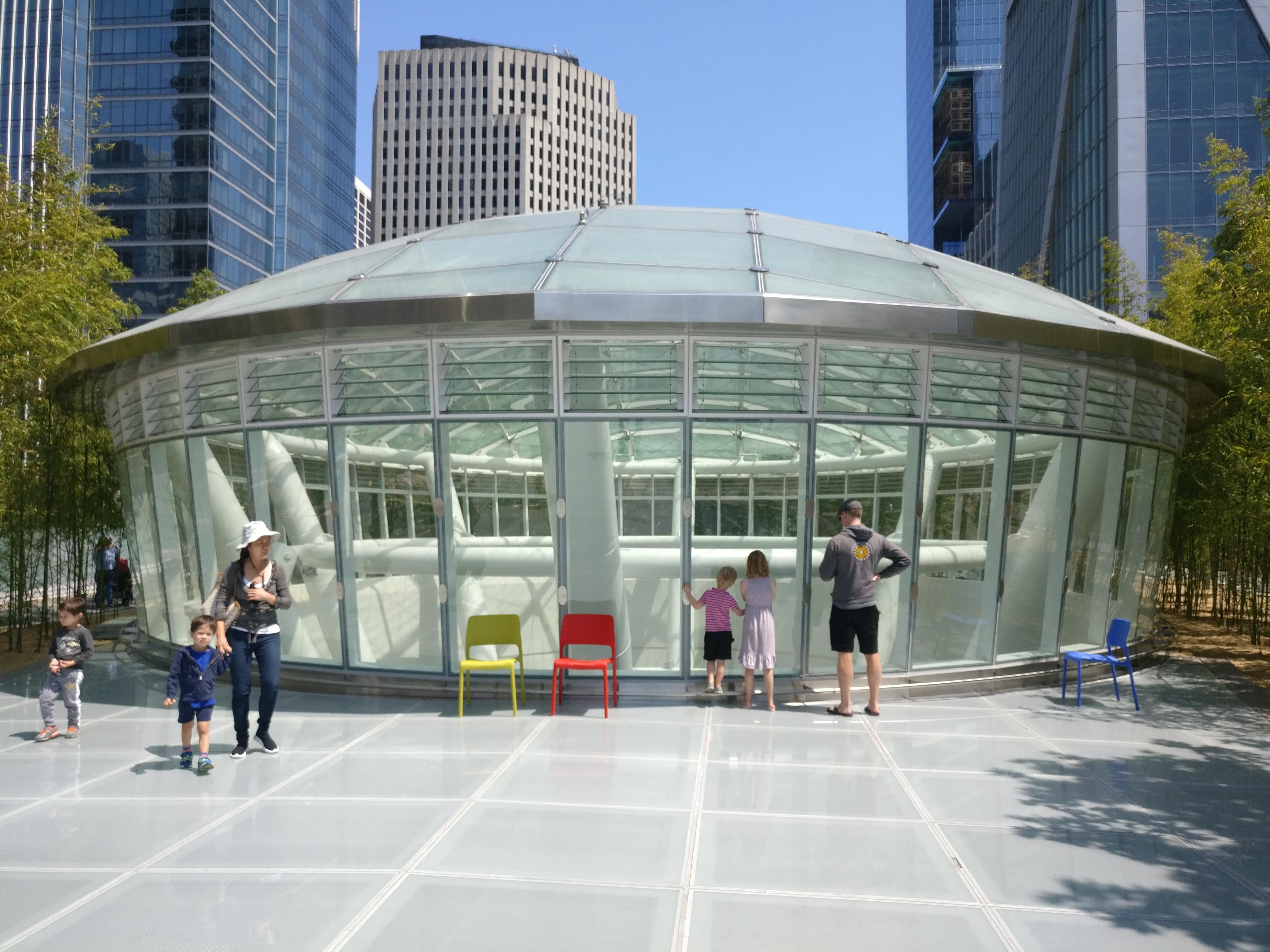 La Salesforce Tower est la pièce maîtresse du plan de réaménagement du plan de réaménagement de San Francisco Transbay, la nouvelle gare routière. Le projet est composé de bureaux, d’une gare routière donc, de commerces et d’une partie résidentielle. Des restaurants vont bientôt ouvrir dans la Tour. Et donc, sur le toit de la nouvelle gare routière, il y a le nouveau Salesforce Park. C’est un mélange d’inspiration de la High Line de Manhattan, une voie verte surélevée de 1,45 mile de long créée sur un ancien axe ferroviaire du New York Central Railroad à l’ouest de Manhattan, à New York, et du bâtiment de bureaux récemment construit par Facebook en face de son siège qui dispose d’un grand parc d’arbres et de verdure.