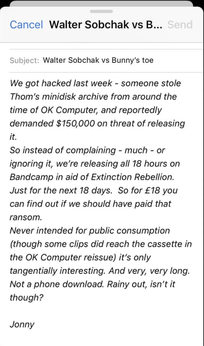 Les pirates ont fixé à $150,000 la rançon pour récupérer les fichiers, sans quoi ils les rendraient publics. Ils auraient dû se renseigner avant. Radiohead est un des rare groupe au monde à avoir proposé à leurs fans de fixer le prix de leur album « In Rainbows » lors de leur départ du label EMI en appliquant le « pay what you want ». Ce qui fut le le septième album de Radiohead, publié sur le site Web du groupe en octobre 2007 sous forme de téléchargement correspondant à la quantité désirée par les utilisateurs, y compris à 0 £ fut saluée comme une révolution dans la façon dont les grands groupes vendent leur musique par les médias. Le nombre de téléchargements a été estimé à 1,2 million de fois sans être confirmé par la direction de Radiohead, affirmant que la distribution était censée stimuler les ventes au détail ultérieures.